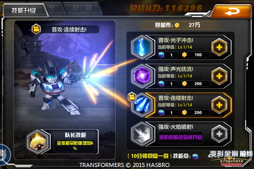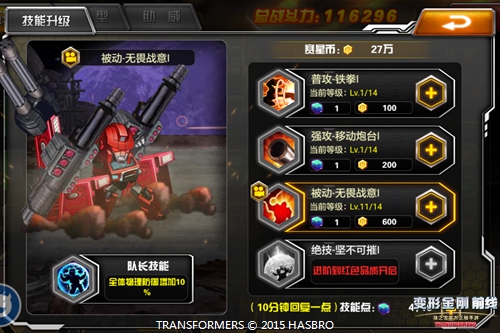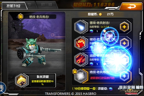 作为依然健在的博派元老级变形金刚,杯子有着无比老道的战斗经验,在教育年轻一辈的汽车人时,他总能从自己的经历中,找到相似的部分并现身说法,虽然这个老头子有点唠叨,但是他硬朗的作战风格和热情无畏的性格,使其成为了金刚迷们津津乐道的传奇人物。杯子在游戏里是一名出色的杀手型变形金刚,其战前技能“老兵扫射”,让他可以稳稳占据先手优势,虽然体质稍显脆弱,但是全面的伤害能力,让这位不死老兵依旧活跃于前线。