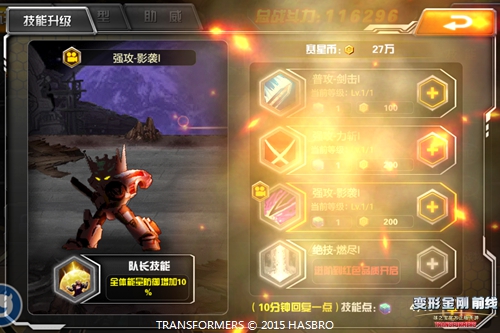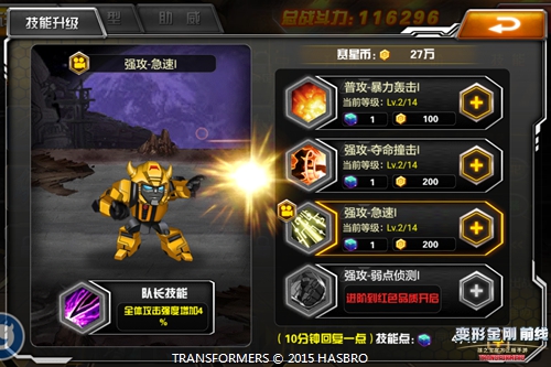 大黄蜂的体型虽然不如其他变形金刚高大威猛,但是他灵活的身手却弥补了力量的欠缺,再加上他平时风趣幽默,作战时却勇猛果敢的特点,让这个颜色和性格一样明朗温暖的汽车人,成为了人气不下于领袖擎天柱的角色之一。在游戏中大黄蜂定位为杀手型变形金刚,他拥有极高的单体输出和一定的单体控制能力,同时攻击技能自带增益BUFF,让他在持续作战中拥有不小的优势。