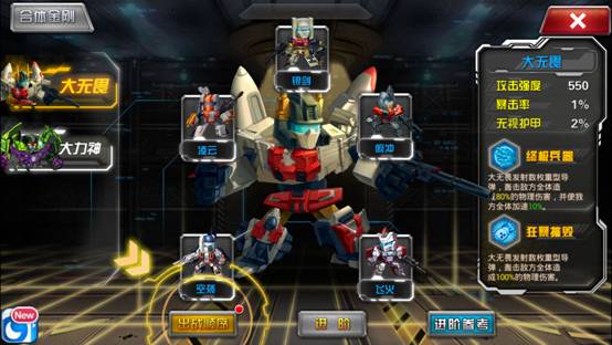 游戏中除了初始角色大黄蜂外,玩家还能额外解锁擎天柱、威震天、爵士等人气角色。围绕这些队长,玩家将展开多条成长线,比如对变形金刚进行改造进阶、对装备进行强化升级都能显著提升战斗力,不同角色之间的命运关系也会影响团队实力。当然,最关键的还是搜集能力超强的合体金刚,依靠其毁灭性的技能扭转战局。