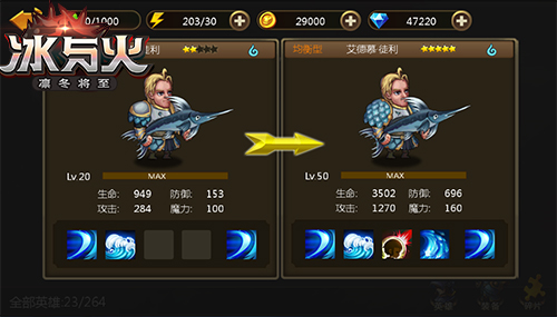 玩腻了一层不变的操作和机械重复的技能打斗,突然有一个可以自己安排战术和角色的游戏,就仿佛沙漠中见到了绿洲一般欣喜若狂。《冰与火》独创的阵容玩法,让你运筹帷幄,玩转维斯特洛大陆!每一个英雄都有自己独特的技能,玩家根据所面临的敌人选择合适的英雄,挑战不同的关卡选择不同的队伍,疗伤辅助,攻防一体,这才是绝佳的搭配。值得注意的是,培养英雄时要选择高星级英雄,而且队伍应该由多元素组成,避免单一。