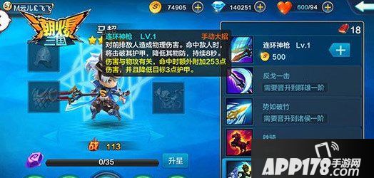 1.连环神枪:对前排敌人进行突击,造成物理伤害。命中敌人时,将击破其护甲,降低其物防,持续8秒。