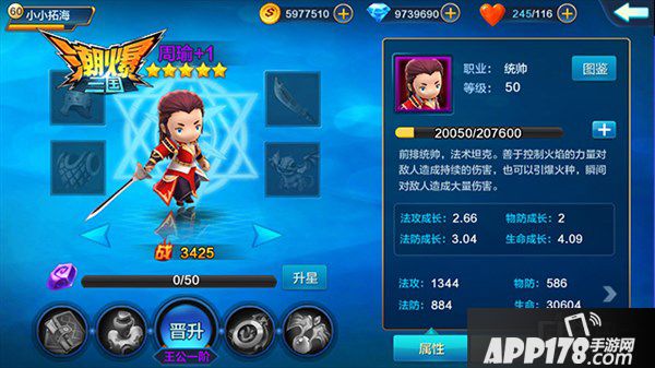 从初始的属性上周瑜最突出的就是生命成长,这也是让周瑜有了非常高的生命值,再配合上非常优秀的法防成长让周瑜成为了前排相当优秀的统帅。周瑜的法攻成长和物防成长虽然不突出,但是在所有统帅中也算不错的,相当的给力。