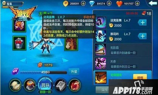 3.无影扇:对敌方中排正对目标造成法术伤害。(升级可提升伤害)。