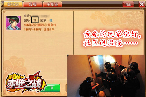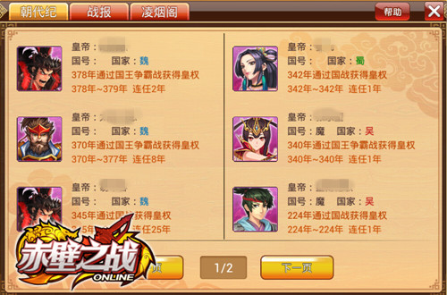 还是简单来说,就是一个史书记录功能,可以记载某某年某某人通过三国争霸之战成为天下共主的皇帝,并且提供最近几年三国争霸战的对战记录给玩家的再战提供 参考。此外在凌烟阁页面,皇帝玩家还能赐婚六名本服玩家以品阶不同的秀女。所以说,能在朝代纪上留名的玩家,他们基本都自带无限无限再无限的明星光环,小 编一直以来都是非常羡慕的说……