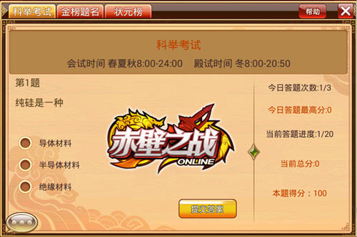 简单来说,就是每年春夏秋0800-2400,点选长安城就可以参加的考试第一名!说起这科举题目,智商余额不足的小编可是做到双眼都要流血流泪的水平, 古诗倒还罢了,游戏武将的兵种、战法技能也还罢了,那出个理科题刁难文科狗有意思么……所以,想入手科举状元,获得银币和魂石的倍数奖励?小编诚意建议在 答题目录没出之前,多百度或者google,甚至在线去问全服玩家或者认为可靠的玩家吧