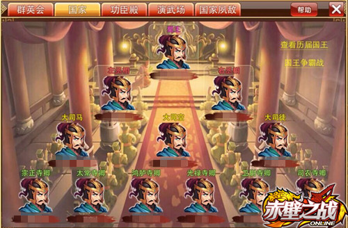 也是简单来说,游戏当中有魏蜀吴三大黑帮,想做到一个所属黑帮的头头(国王),小编在想,除了用刀剑来讲道理外,也找不到其他方法了。而且在《赤壁之战 OL》中,国王没有连任甚至世袭的道理。这一届你通过千军万马成为储君,再在储君双雄对决中成为国王,下一届你依然要重复此挑战流程,枪杆子里出国王。不 过做到国王之位可以任命其他玩家担当官员,并且在国战中有鼓舞决策权,一国兴衰掌于手中,还是挺爽快的!