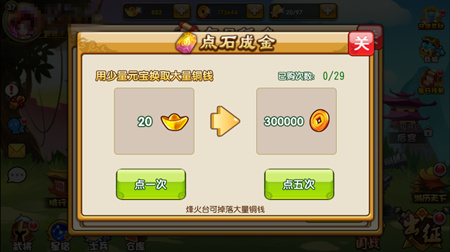 游戏中获得铜钱最简单的粗暴的方式,主公可直接使用20元宝兑换30W铜钱,但兑换次数越多需要的元宝越多,土豪请随意。在《曹操别跑ol》中还隐藏着许多其他获得铜钱的小方法,一起和我找找吧。
