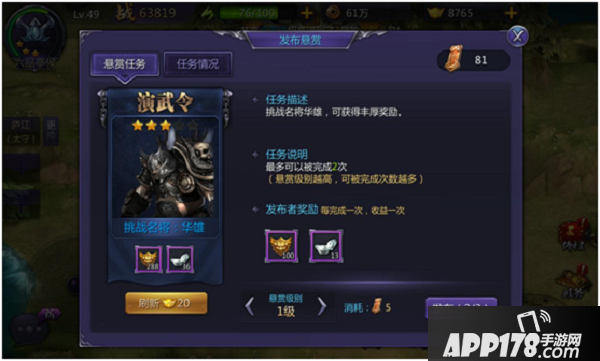 D、悬赏任务——悬赏任务发布和完成均会获得一定量的官银,且量的多少跟任务星级挂钩。
