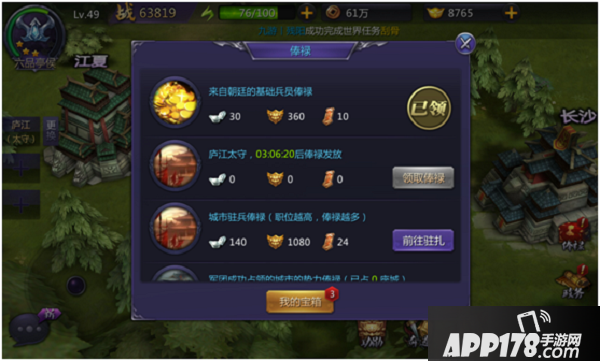 B、太守、驻兵俸禄——有付出就有收获,去当了一把手,会有大把的官银(大家都懂的),当然,即使当不了一把手,一个小小的驻兵也是有不菲的收入的,平均每6个小时就有大量(这个跟城市的大小有关)的官银,一天一个驻地收入的官银即在500以上,3个驻地,一天收入为1500以上,是基本工资的50倍........这,也就是为什么能好好的养活自己的重要原因。