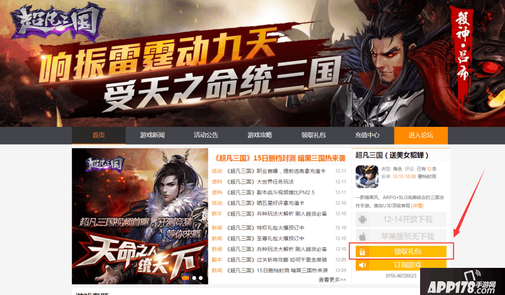 1、《超凡三国》专区页面右边有“领取礼包”的按钮;