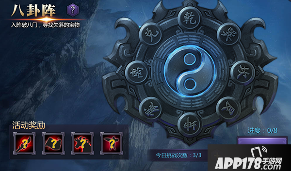 当角色通关战役副本第五章后,即可开启八卦阵的玩法。入阵破八门,寻找失落的宝物。