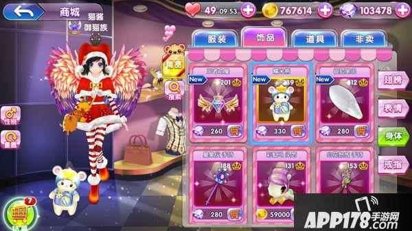 圣诞套装+紫翼神圣翅膀+微笑表情~头顶喵喵星晴头饰,手拿超萌的悠嘻猴布偶,脚边带上可爱的糯米熊小跟班~虽然距离圣诞节还有半年,但是在《唱舞团》的音乐世界里,没有什么不可以=w=~