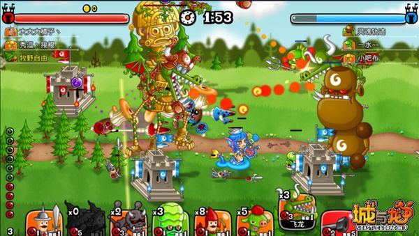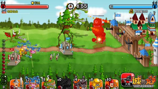 《城与龙》基本玩法就是要比对手更快速的贡献城池,玩家进入游戏前可以根据战斗均衡选择怪物,怪物又分为进击和迎击两种。进入游戏后,屏幕左方有一排10个的召唤珠,每召唤一个宠物需要消耗指定数量的召唤珠。召唤行为必须在召唤区间线左边。玩家可以通过攻陷中立小城堡,拓展占领的召唤范围,场地的优势会让你能更快速的攻击到敌人哦。