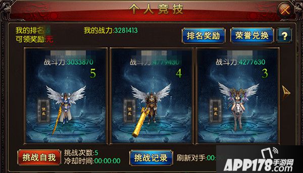 个人竞技的玩法有两种。一种玩法是挑战其他玩家。游戏依据玩家战斗力排名从高到低排序,玩家可以根据随意选择。PK时间设置一分钟,大部分玩家都在几十秒内结束PK。PK失败的玩家,可获取经验值80000和荣誉值10,同时排名不变。PK获胜的玩家,也是获得经验值80000和荣誉值10,但是排名可以提升一位。每日玩家可以挑战5次,每次之间的冷却时间为10分钟。