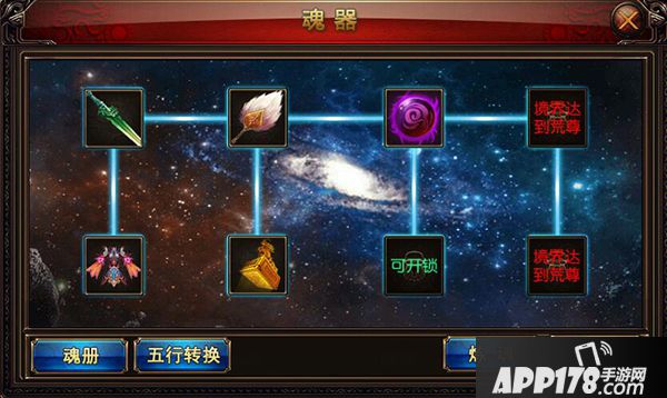 “魂器”的主要界面分两排。上面一排开启魂器位置,不仅需要达到对应的境界,还需要对应数量的解魂石。解魂石的获得可通过商城购买。下面一排开启魂器位置,需要拓魂石数个已经同样的境界。