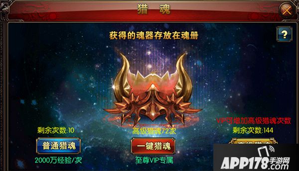 针对魂器的练就,除了转换到最佳的五行,还可以通过“炼魂”来提高魂器的战力。《楚汉传奇》为玩家提供三种方式。普通猎魂,即消耗一定的经验值;一键猎魂,至尊VIP专属,花费一定元宝数目,炼魂72次;高级猎魂,消耗元宝,直接获得炼魂丹来提高魂器附带战力。再到“炼魂”界面直接进行魂器升级。