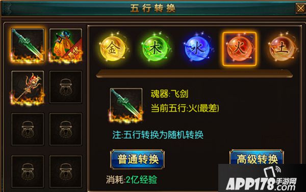 针对每一种魂器,《楚汉传奇》提供了“五行转换”的选择。魂器有自己绝佳的五行属性,玩家通过“普通转换”和“高级转换”来实现魂器的五行转换。小编在这里要提醒玩家,五行转换的效果是随机的,所以花费一定的经验和元宝并不能确保实现最佳的五行。