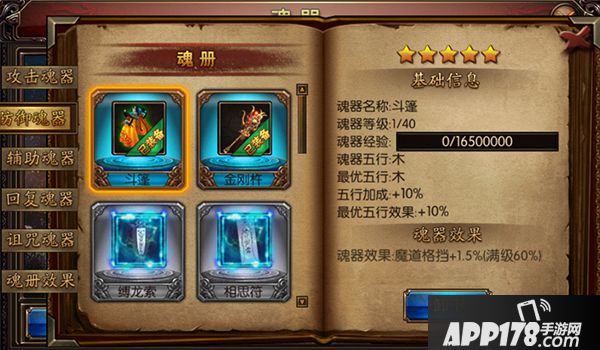 开启魂器位置,即可看到魂册界面。玩家根据自己的寻求,可在“攻击魂器” “防御魂器” “辅助魂器” “回复魂器”中选择魂器。不同魂器的基础信息不同,附加的效果也不同。