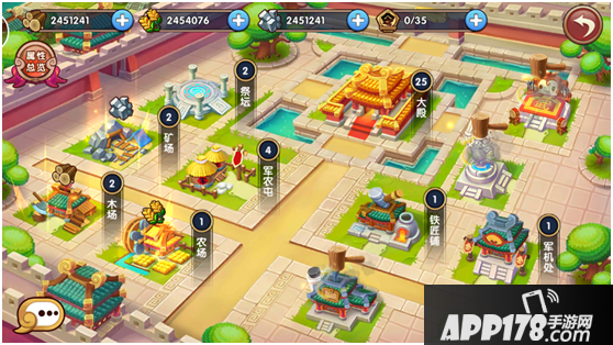 当将军的等级达到30级的时候,就可以拥有属于自己的城池了,还没有到达30级的将军可要加油了。在主界面下方最左边,我们能看到城池图标,点击就可以进入城池管理的主界面了哦。刚一进来,真是把小美惊艳到了,富丽堂皇的大殿,各种建筑设施,绿化也搞得很到位,简直就是百废待兴啊!小美已经等不及要兴它了。要修建筑,肯定首先得要有资源,那资源怎么来呢?