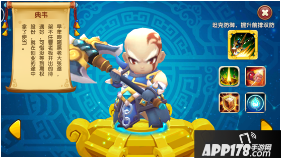 典韦作为一个纯肉型坦克,技能方面带有眩晕效果,有较强的控制及打断能力,团队增益针对前排武将提升双防,增加前排生存能力。属性成长方面,典韦的双防较为均衡,搭配输出型前排有较好的提升。
