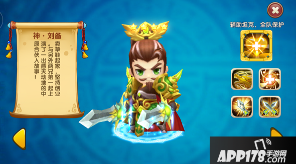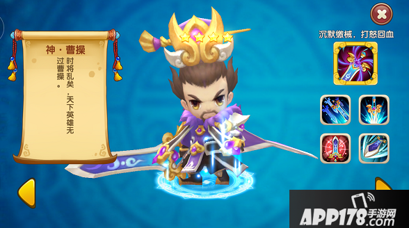 曹操的定位是"沉默缴械,打怒回血",是一位后排带辅助效果的输出型武将,在辅助行列里,曹操是当仁不让的第一位,他的技能带有吸血吸怒气的效果,而且升阶紫色后出场就有几率缴械敌人;刘备则是一名辅助型坦克,进站即增加自身生命值,不但拥有超高双防,还能减少敌方伤害、治疗队友,保护全队。