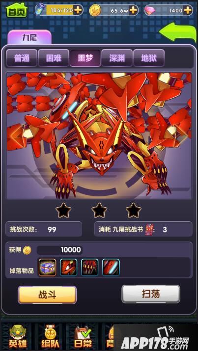 根据挑战魔神的难度可以把魔神关卡分为普通、困难、噩梦、深渊和地狱5个等级,挑战魔神需要消耗对应的魔神挑战书,通关三星后可以直接对魔神关卡进行扫荡。