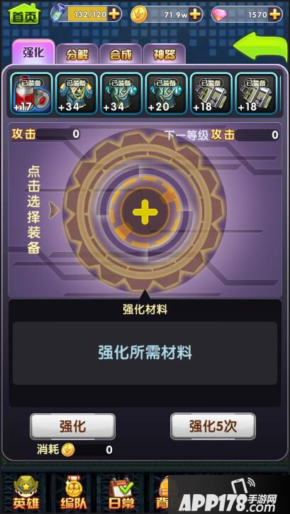 在主界面点击“兵工厂”按钮,即可进入兵工厂界面。在这里可以对武器、防具、徽章和涂装等装备进行强化与合成,也可以分解各种装备以得到强化其他装备的材料,还可以铸造你想要的神器哦。