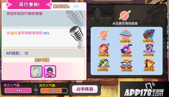 玩家每天可以参与3次导师考核(VIP玩家可以购买参与次数),考核关卡分摇滚试唱、流行考核、古典练声三种,每周前6天循环开启,周日全开。歌手在类型不匹配的关卡中考核能力会大打折扣,比如摇滚类型以外的歌手在参加摇滚试唱考核时属性会降低95%。因此挑选歌手参加对应的考核可以大大增加通过率。