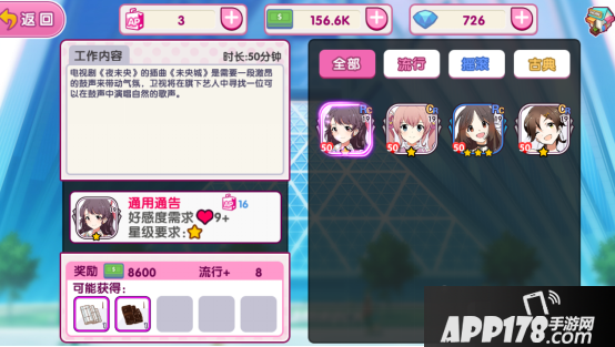 通告的难度主要体现在接取条件上,接取条件包括:好感度、称号、星级三点。歌手的需要同时满足通告对应的3点要求才能接取。