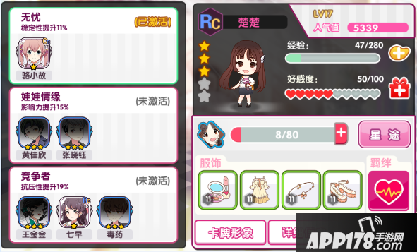 《超级女声》手游羁绊玩法可以理解为卡牌组合玩法,从卡牌详情界面的“羁绊”按钮中进入。