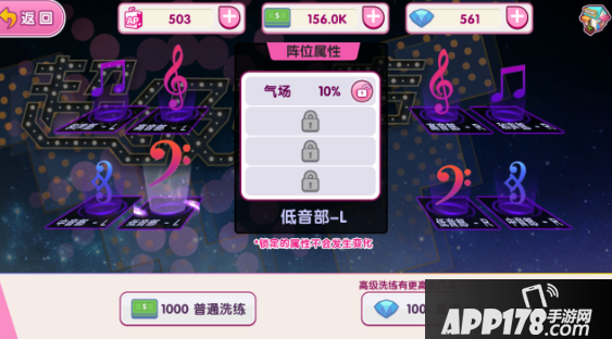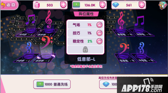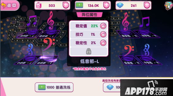 伴唱位洗练分为普通洗练和高级洗练两种,分别消耗一定的游戏币或者钻石,其中高级洗练将更有可能获得高属性加成。