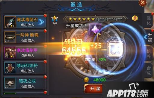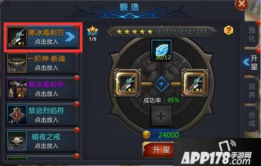 装备升星方法,在锻造界面左边选择您需要升星的装备,在右边会显示装备升星所需要的升星石数量和金币,以及装备升星后的装备预览