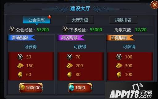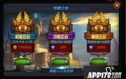 花费金币或者钻石,可创建公会,当你的VIP等级比较高时,不妨尝试创建一个高级公会,公会的起始等级会比较高,俗话说万事都要赢在起跑线上嘛,高等级的公会初期会员的上限也会比较高,开放的功能也更多。