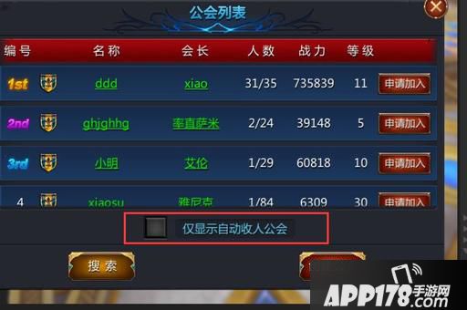 如果觉得做会长会负担太大,也可以选择加入公会,在公会列表中先勾选【仅显示自动收人公会】后,显示的公会都是只要申请便能自动加入该公会,是不是很方便就能寻找到组织了。
