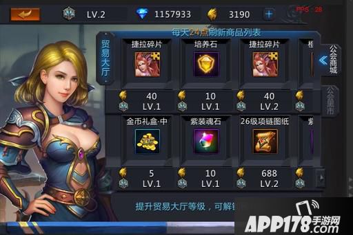 公会商城中可购买各种稀有道具,贸易大厅的等级越高,可购买更高级的稀有道具。