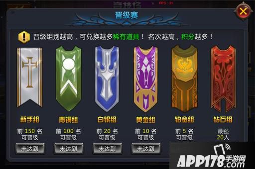 竞技场一共分为6个分组,新手、青铜、白银、黄金、白金、钻石,通过参加晋级战可以提升玩家自身组别。达到当前组别晋级区的玩家可以开启晋级战晋级战的规则:晋级的玩家随机在上层组别末尾区域选择一名对手进行对战,如果战胜对手,则两人的排位互换,挑战方晋级成功,被挑战方下降一个组别,掉到挑战方的之前的排名。