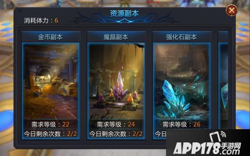 在玩家的等级达到22级后将开启第一个资源副本,之后每提升2级后将开启下一个类型。