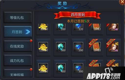 Ø 月签到,累积签到天数越多,获得的奖励月丰厚,并且VIP等级越高,获取的奖励还会翻倍的哦