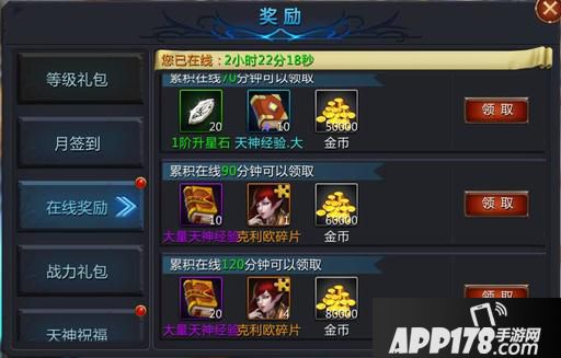 Ø 在线奖励,不仅有金币还有天神碎片和大量天神经验