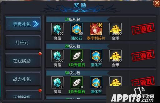 Ø 等级礼包,达到相应等级可以领取对应等级的等级礼包
