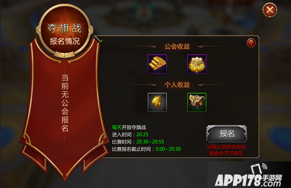 夺旗战每天0:00~20:30之间,可以由10级及以上公会的会长和副会长进行报名。报名后,公会成员可以在20:25分通过主界面上的“夺旗战”按钮进入夺旗战地图,进行夺旗战。