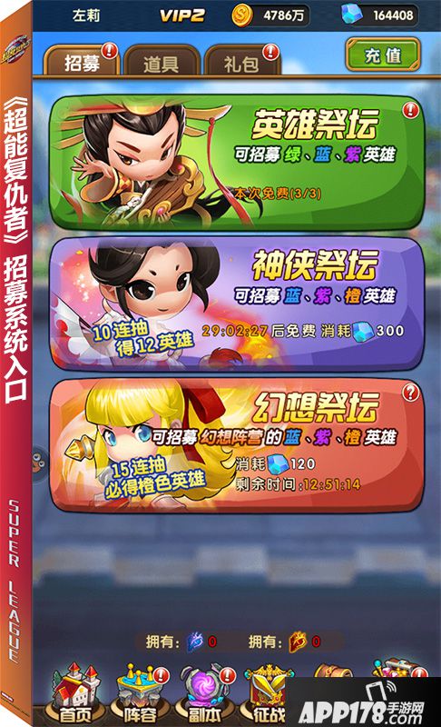 “招募系统”是游戏内玩家获取英雄的一个重要途径,共有“英雄祭坛”、“神侠祭坛”、“幻想祭坛”等多种方式。通过招募,玩家们可以获得绿色、蓝色、紫色、橙色等不同品质的英雄成品。