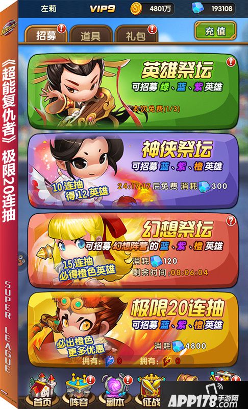其中,共有英雄祭坛、神侠祭坛、幻想祭坛等多种形式,当达到VIP8后,还可以开启必得橙色英雄的“极限20连抽”。