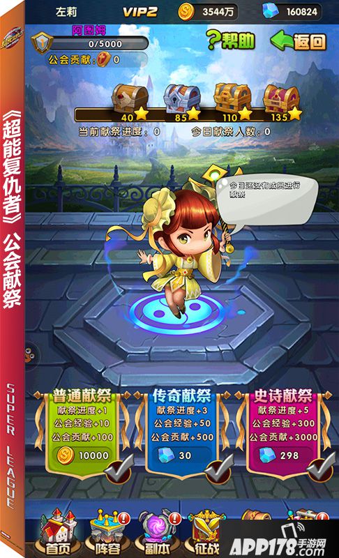 公会贡献可以在公会首页【公会祭献】页面获得,共有普通献祭、传奇献祭、史实献祭3种方式,玩家每天可以选择一种方式进行献祭祈福。值得一提的是,献祭时有几率触发暴击,公会贡献和公会经验翻1.5倍,当献祭进度达到不同阶段后,全体公会成员都可以领取进度奖励。