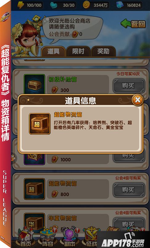 点击左上角【公会商店】,即可购买补给箱、物资箱、觉醒丹、金币、黄金宝宝等进阶道具。