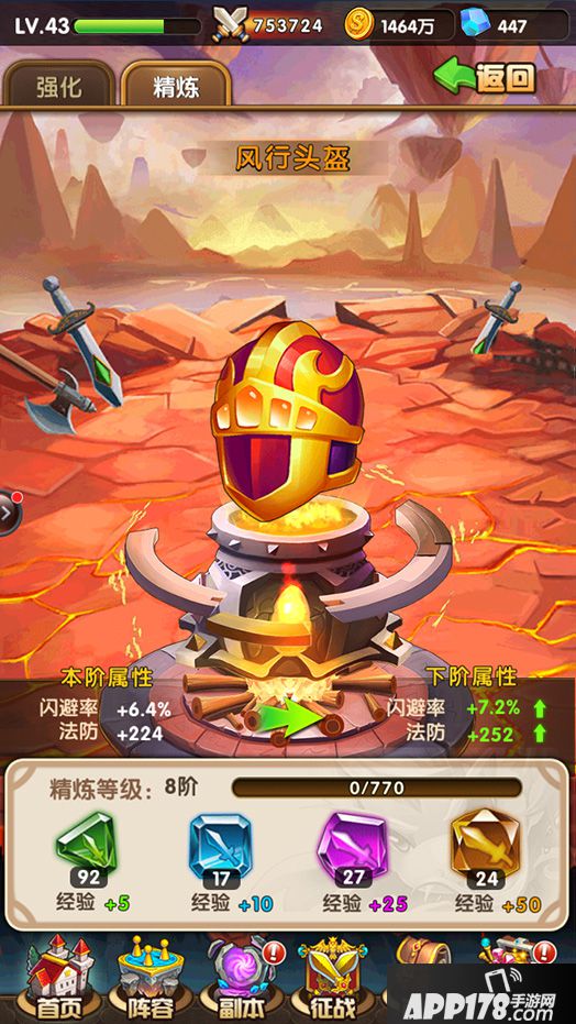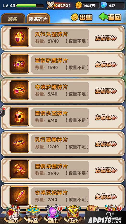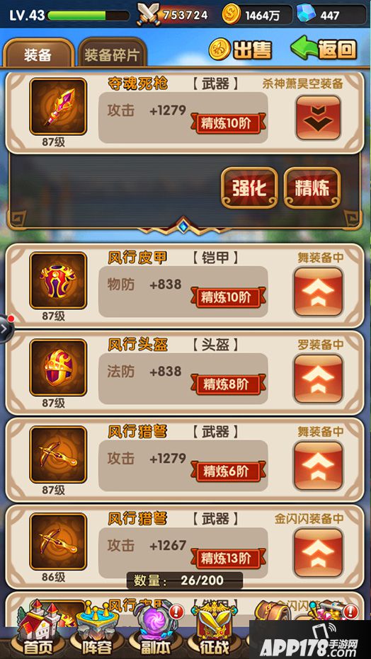 在首页左下角“装备”按钮里,筒子们可以查看到所有装备或是装备碎片的详细信息,实现装备的强化、精炼等功能(在阵容界面点击英雄身上的装备也能强化、精炼,还能进行更换、卸下等操作),碎片详情页则能实时了解到最新的装备碎片进度,专注搜集即将能合成成品的装备、及时合成碎片已集齐的装备。
