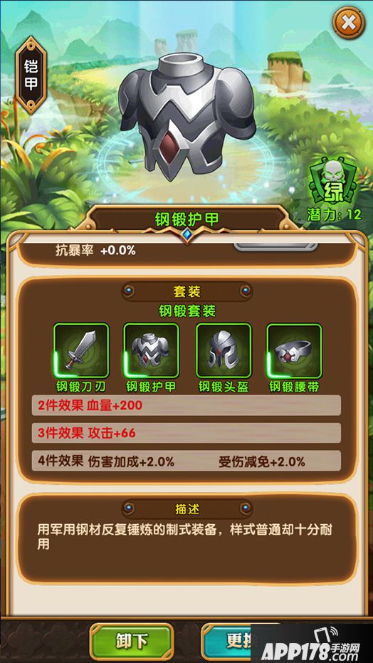 游戏里的装备从低到高一共分为绿、蓝、紫、橙、红五个等级,不同等级下设不同属性倾向的套装,有的偏血量、防御,有的偏攻击、暴击。