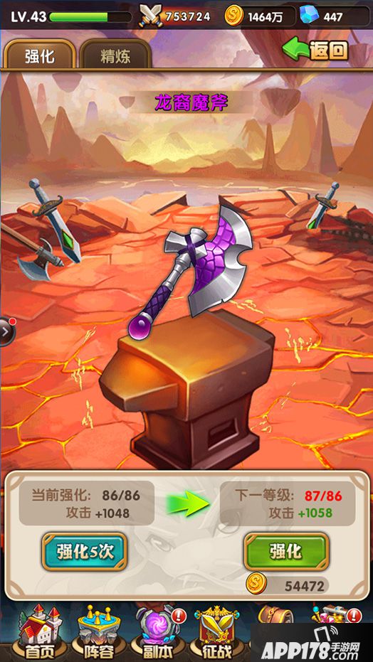 强化、精炼装备将能极大的提高战斗力,强化消耗金币,一次性强化5次容易触发“暴击”,“强化暴击”能自动免费多强化一定等级。精炼则需要消耗精炼石,本座建议在前期装备更换频率较高的情况下不要精炼装备,把精炼石省下来留给后期等级更高的装备能获得更大的收益,同时减少消耗(绿装别精炼,蓝装看情况)。