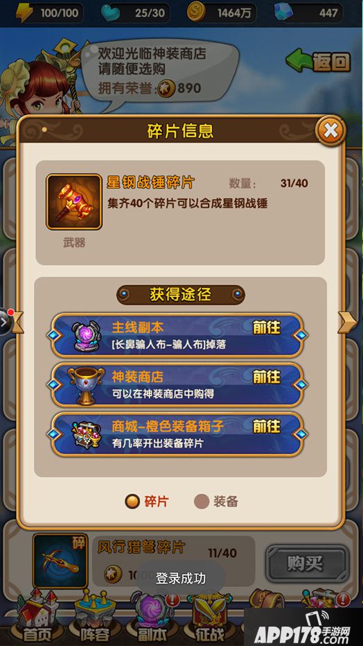 装备的获取途径十分多样,筒子们既可以攻打主线副本获取装备碎片,也可以在英雄塔里的神装商店通过荣誉点购买,土豪们更可以直接前往商城购买各色装备箱子开出装备碎片。