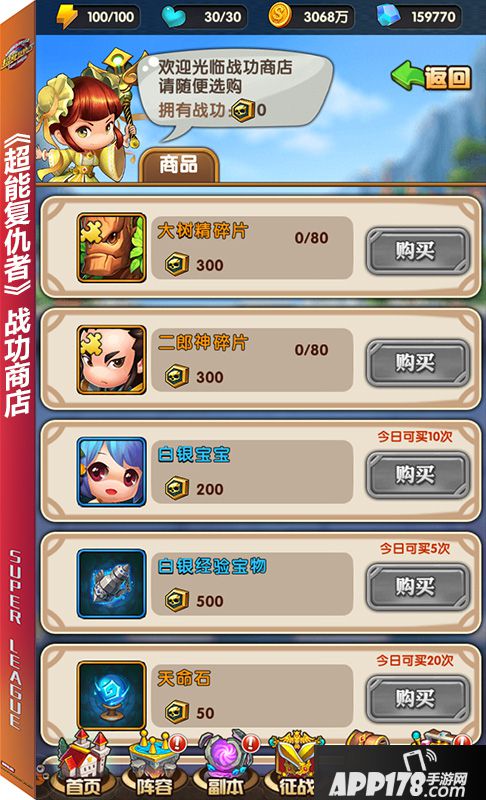参与恶魔入侵还能获得“战功”,玩家们同样可以在右上角“战功商店”购买橙将碎片、天命石等材料,提高自己阵容的整体实力。
